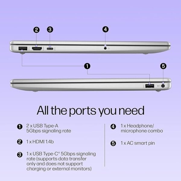 - Ports & Connectivity :1 USB Type-C 5Gbps signaling rate (supports data transfer only and does not support charging or external monitors); 2 USB Type-A 5Gbps signaling rate; 1 AC smart pin; 1 HDMI 1.4b; 1 headphone/microphone combo| Connectivity: Realtek Wi-Fi 6 (2×2) and Bluetooth 5.3 wireless card (supporting gigabit data rate)