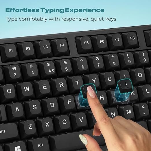 • ✅ Full-Size 104-Key Wireless Keyboard – Smooth, low-noise typing with all essential keys, including a dedicated ₹ Rupee key for Indian users.