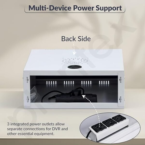 • As shown in the images, these 2U racks for CCTV DVR comes with 6 amp plug and an in-built 3 power socket for your electronics devices. It has a fan mounting provision for heat exhaustion and a key-lock system for easy and secured access.